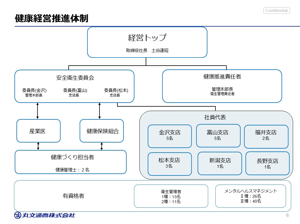 丸文通商株式会社は、社員が心身ともに元気に働ける職場を目指して、健康づくりのため下記の事項に取り組みます。