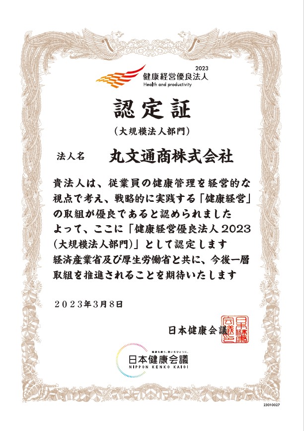 このたび丸文通商は、経済産業省 健康経営優良法人2023(大規模法人部門)の認定を取得しました。
