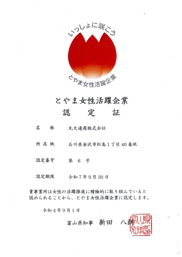 2022.09.06 第1回とやま女性活躍企業 認定取得 9月1日、第1回とやま女性活躍企業 認定証交付式が行われ、丸文通商 富山支店が認定を取得しました。 これは、女性が活躍する富山県内の企業等を県が認定する制度です。 富山支店では、女性が活躍し、いきいきと働きやすい職場づくりを継続して行います。 以上