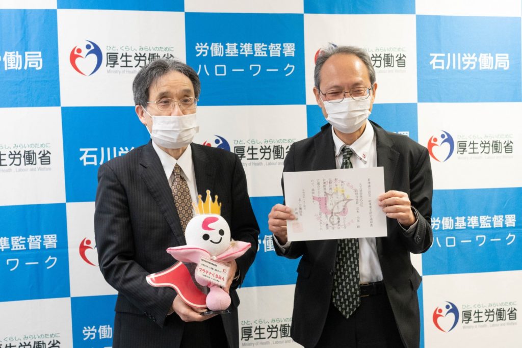 (左)石川労働局長 吉田研一氏 (右)丸文通商株式会社 越野智明 管理本部長