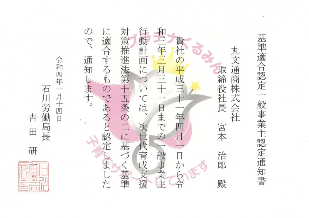 この認定は、「子育てサポート企業」として厚生労働大臣の認定を受けた証です。