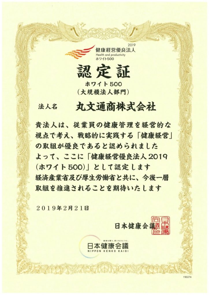 2019.03.06 健康経営優良法人2019(ホワイト500)」 認定取得 平成31年2月21日に「健康経営優良法人2019(ホワイト500)」として認定書を頂戴しました。 当社の健康経営に関する積極的な取り組みと実施状況が認められました。 ※「健康経営優良法人2019(ホワイト500)」とは、健康経営が組織の活性化をもたらし、結果的に業績向上や組織としての価値向上へ繋がることが期待されるという経営的視点で考え、戦略的に取り組んでいる企業を経済産業省が顕彰する制度です。企業名を国民に広く周知することで対象企業の社会的な地位、信頼性を向上させる効果が見込めます。 以上